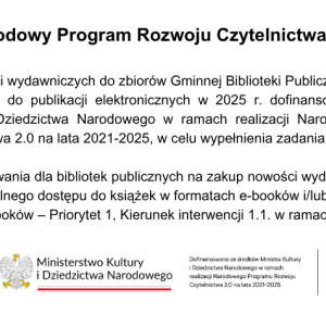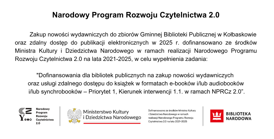 Z radością informujemy, że Gminna Biblioteka Publiczna w Kołbaskowie pozyskała dofinansowanie z Ministerstwa Kultury i Dziedzictwa Narodowego na zakup nowości z Narodowego Programu Rozwoju Czytelnictwa 2.0. uchwalonego przez Radę Ministrów na lata 2021-2025.