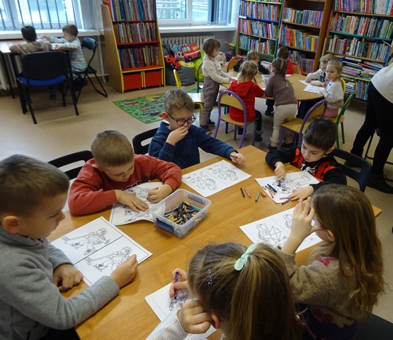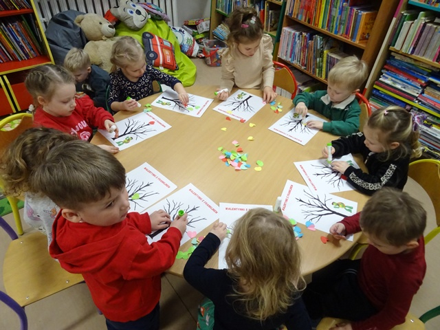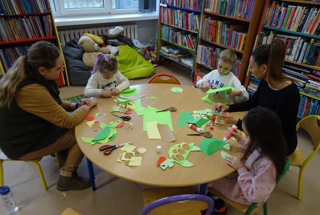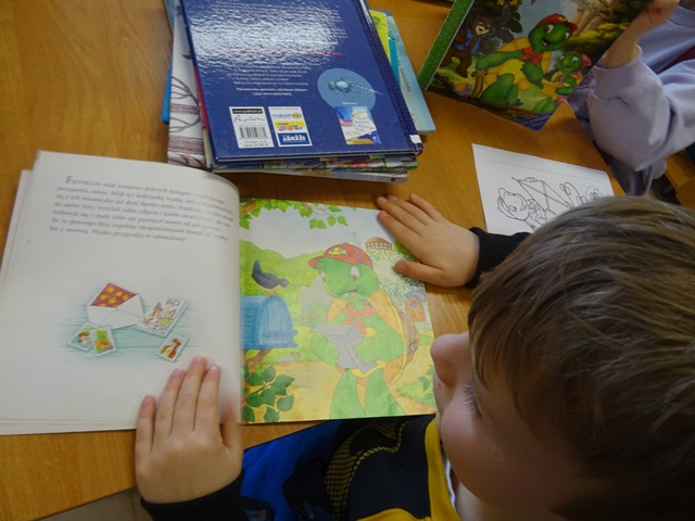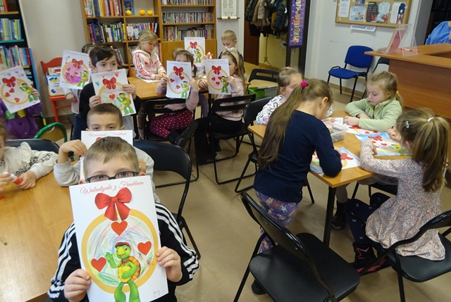 Szukały różnic na obrazkach, zagubiły się w labiryntach, w których Franklin szukał drogi do przyjaciół, układały puzzle i kolorowały obrazki z naszym małym bohaterem. W drugim tygodniu Franklin przygotowywał się do Walentynek. Nasz przyjaciel zgubił swoje kartki dla przyjaciół. Co się z nimi stało? Czy je odnalazł? Tego dzieci dowiedziały się z opowiadania „ Franklin i Walentynki”. Podczas warsztatów powstały piękne prace: żółwie, drzewka z serduszkami oraz kartka walentynkowa dla ukochanej osoby. Przez cały okres ferii asystował nam nasz słodki biblioteczny żółw.