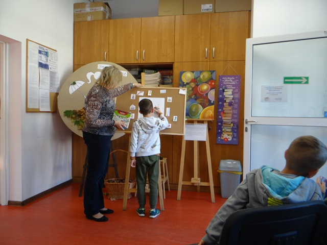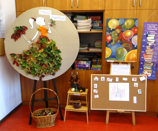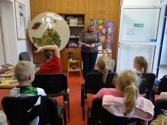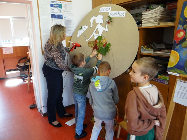 Na początku dzieci wysłuchały opowiadania Leo Buscaglii „Jesień liścia Jasia”, a następnie porozmawialiśmy o zmianach, które jesienią zachodzą w przyrodzie. O zbieraniu owoców i warzyw, grzybów, o kolorach liści, krótszych dniach i zmianie temperatury. Później uczniowie "uszyli" z liści suknię Pani Jesieni. rozwiązały krzyżówkę i oglądały książki.