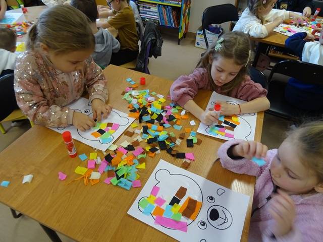 Malinki, Śliwki, Truskawki i Poziomki usłyszały historię pluszowego misia i poznały najbardziej popularnych misiowych bohaterów: Puchatka, Uszatka, Koralgola i Paddingtona. Wysłuchały opowiadań: „Paddington i spacerek literek”, „Puchatkowy ogród”, „Niedźwiedź łowca motyli” oraz „Elmer i zagubiony miś”. Dzieci układały misiowe puzzle, wykonały misie do postawienia i przywieszenia a maluchy otrzymały misiowy medal. To był naprawdę miły misiowy tydzień. Dziękujemy